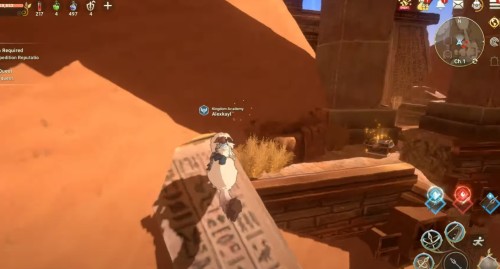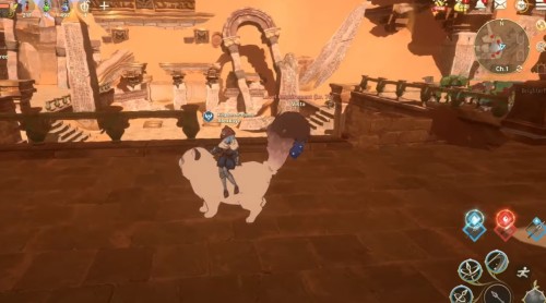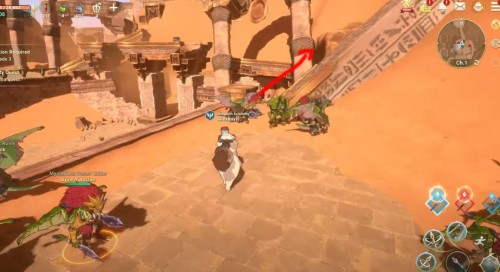 Сначала поднимитесь наверх по разрушенной части стены. Затем сядьте на ездовое животное и прыгните на другую часть разрушенного строения. С него перепрыгните к месту, где стоит сундучок.
