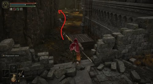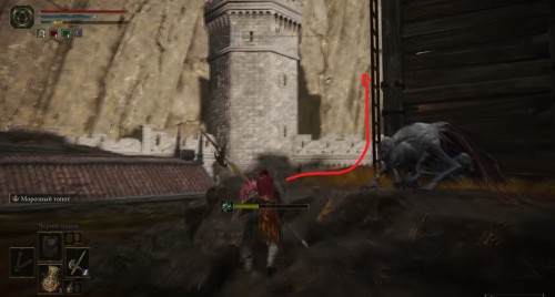 Оказавшись в окрестностях крепости, бегите направо вдоль стены. Там вы увидите наклоненную плиту, по которой можно взобраться на ограждение. Поднявшись, сразу же пройдите через полуразрушенный участок стены, чтобы попасть во внутреннюю часть замка. Бегите через ядовитые лужицы вперед, в другую часть локации. Затем поверните направо и поднимитесь по лесенке.