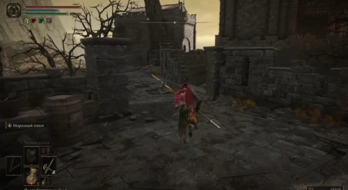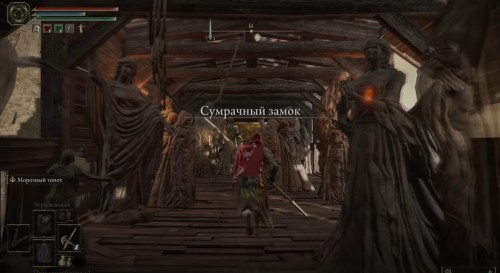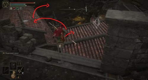 Взобравшись на очередную стену, пройдите немного вперед и сверните налево, а потом подойдите к дыре в ограде справа и спрыгните на крышу здания внизу. С него перейдите на другую постройку, а потом поднимитесь наверх по наклонившемуся дому, чтобы добраться до центрального сооружения. Пройдите через открытые ворота, и вы найдете место благодати «Внутренние врата Сумрачного замка».
