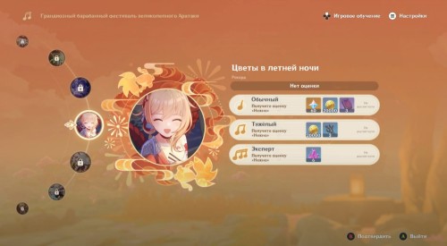 Итак, снова поговорите с Гэнтой и выберите вариант «Давай начинать». Всего вам нужно будет сыграть 7 мелодий. Пока что доступна только одна – остальные откроются в течение недели. Каждая композиция имеет 3 уровня сложности: обычный, тяжелый и эксперт. При этом для получения наград достаточно сыграть на оценку «Нежно», то есть допустить не больше 15-20% ошибок.