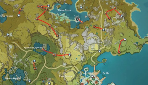 Далее можно спуститься на юго-восток к побережью Сокола, мысу Веры и ущелью Дадаупа. Здесь можно отыскать 24 тычинки, расположенные рядом с телепортационными точками и подземельями. На их сбор вы потратите около 10-12 минут. Лучший маршрут для фарма в регионе.
