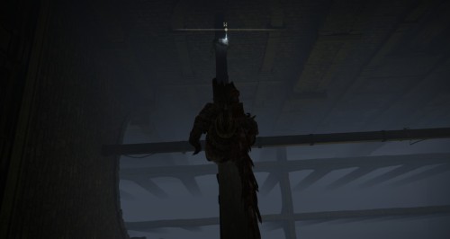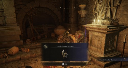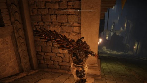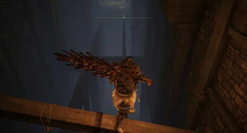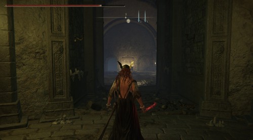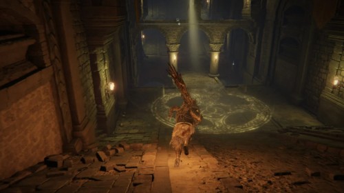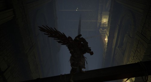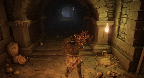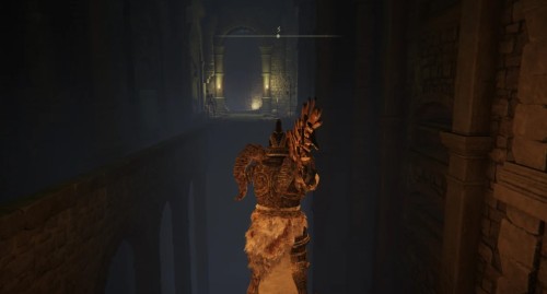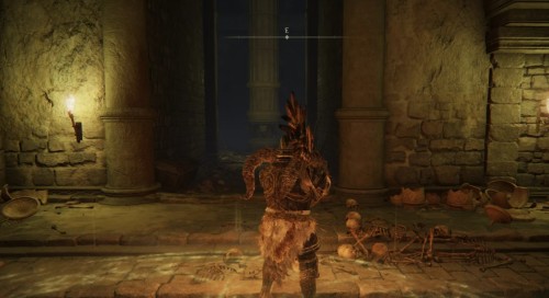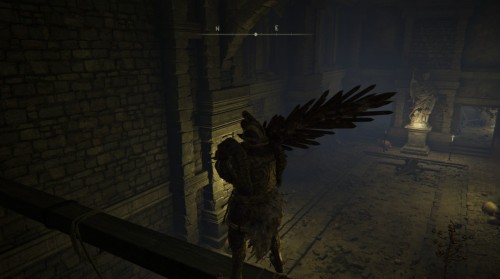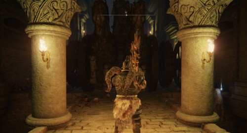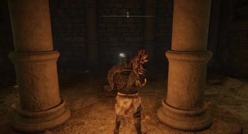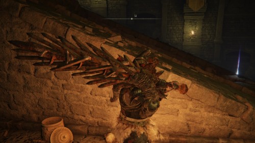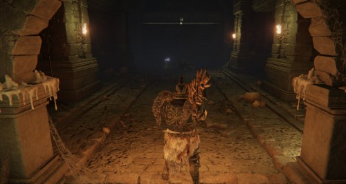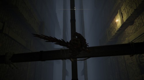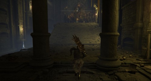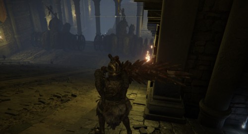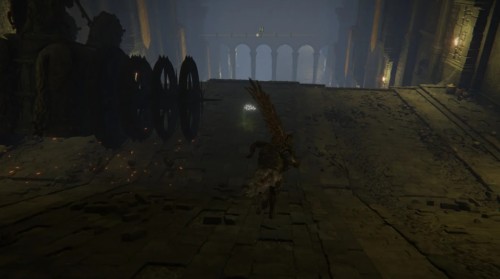 Если вам повезло, и вы смогли пройти мимо колесницы и попасть в следующий проход, то следуйте по нему и спуститесь по лестнице. Здесь вы столкнетесь со Знамением, охраняющем Перьевой талисман (повышает время неуязвимости во время переката на 6 кадров). Затем вернитесь назад в проход и поверните направо. Поднимитесь по лестнице и воспользуйтесь лифтом, который поднимет вас в комнату с другим огнеметным столбом.