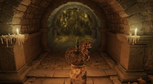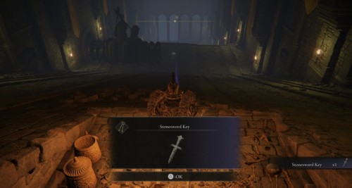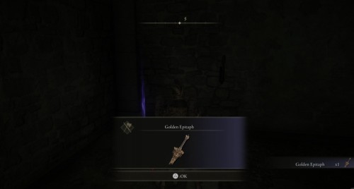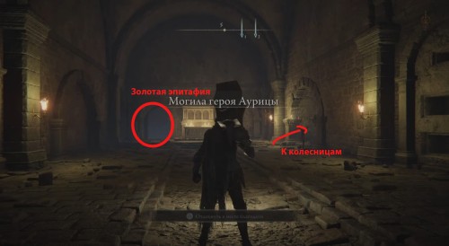 После активации места благодати вы увидите впереди проход, закрытый туманной пеленой, и для его открытия вам потребуется один мечевидный ключ. Сделав это, пройдите в помещение и разберитесь с двумя василисками, которые неожиданно атакуют вас из тьмы. Затем осмотрите останки, чтобы подобрать меч Золотая эпитафия.