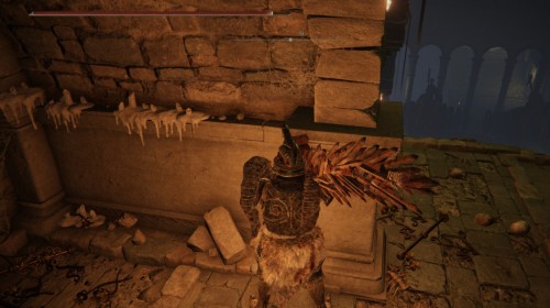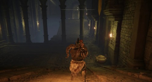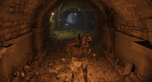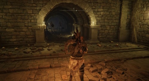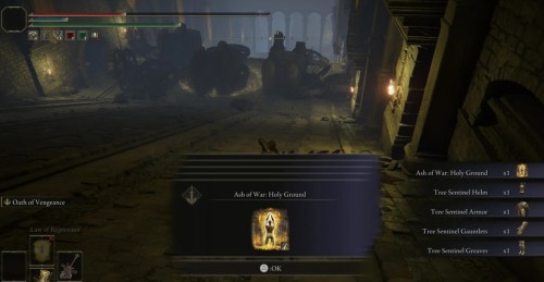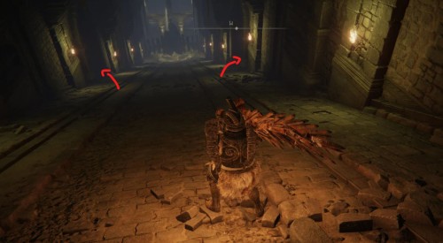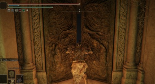 Добравшись до ниши, подождите, пока колесница не проедет мимо вас, двигаясь наверх, а затем спуститесь вниз по склону и забегите в другую нишу слева. Когда колесница снова проедет рядом с вами при подъеме, пробегите вниз до самого конца и зайдите в проход слева с двумя скелетами. Правильно подобрать время здесь крайне сложно, однако не беспокойтесь, если вы умрете тут. Дело в том, что из-за удара по колонне вы заспавните еще одну колесницу, поэтому все они попросту разобьются и больше не будут вас беспокоить, что упростит вам возвращение к месту вашей гибели. Вы также получите в награду Пепел войны: Свята земля и комплект брони Стража Древа.