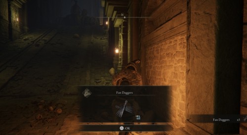 Вашей следующей задачей станет спуск к светящемуся кругу внизу. Подождите, пока колесница не проедет мимо вас, двигаясь наверх, а потом сразу же бегите вниз и остановитесь, как только доберетесь до каменной арки. С другой стороны появится еще одна колесница, но пространство прямо под аркой защищено от обеих колесниц. Подождите, пока этот новый враг не поднимется, а затем подберите несколько Веерных кинжалов с трупа, лежащего на краю уступа. Возвратитесь в безопасное место под аркой. Спрыгните с любой стороны от узкой арки, чтобы продолжить прохождение подземелья.