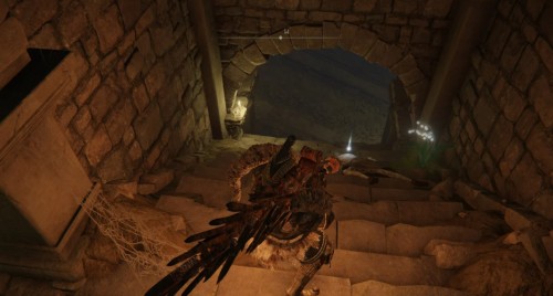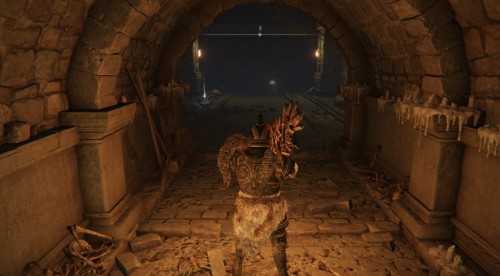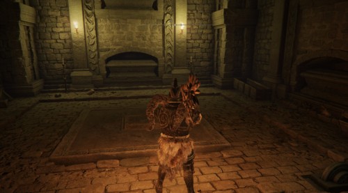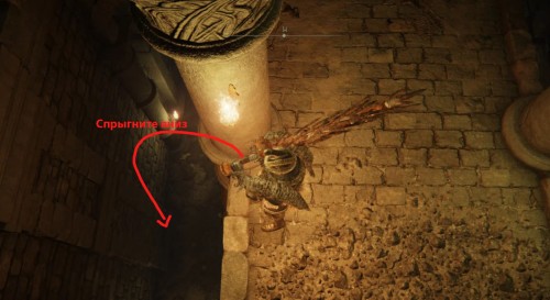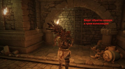 Двигайтесь вдоль стены и вскоре вы заметите каменную постройку впереди. Войдите в нее и спуститесь на лифте вниз. Сделайте несколько шагов вперед и активируйте «костер» подземелья. Теперь вы можете взяться за его прохождение.