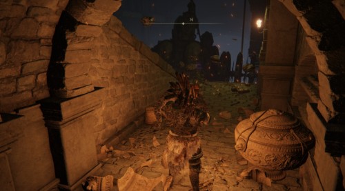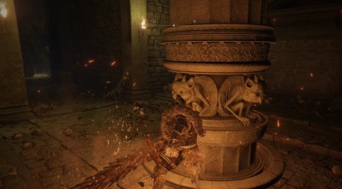Вместо того чтобы идти вниз, вам нужно будет подняться наверх и пройти в комнату, проход в которую находится с правой стороны. Подождите, пока колесница не проедет мимо вас, двигаясь вниз, и бегите вверх. Там забегите в скрытую комнату, где вы найдете огненный столб и Могильный ландыш [6]. Эта колонна является ключом к уничтожению колесниц, поскольку в ней содержится светящаяся глифа, которая порождает колесницы. Ударьте по колонне, чтобы поднять ее вверх, но будьте осторожны, так как из нее начнет выходить пламя.