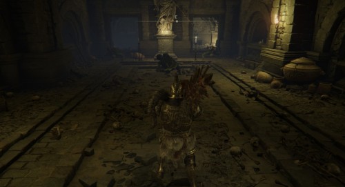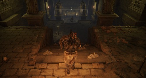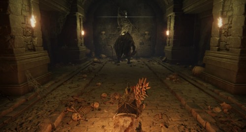 Далее идите на север, поднявшись по склону, откройте двойные двери и войдите в следующую комнату. Спуститесь по лестнице, разберитесь с тремя скелетами, подойдите к туманным воротам, и пройдите через них, чтобы начать сражение с боссами.