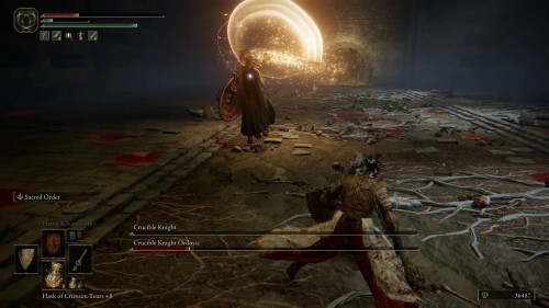 Обычный Рыцарь Горнила будет вооружен зубчатым копьем, а Ордовис – своим фирменным двуручным мечом, обладающим уникальным навыком. Даже если вы уже сражались с одним из них раньше, битва с двумя превратится для вас в настоящую боль из-за большого радиуса поражения их оружия и гиперагрессивных атак. По этой причине настоятельно рекомендуем вызвать своего самого крепкого духа: он позволит, либо захватить внимание обоих рыцарей (тогда вы сможете нанести им серьезный урон сзади), либо отвлечь хотя бы одного из них, чтобы вы смогли справиться со вторым. Мы рекомендуем использовать Прах солдат с большими щитами, так как они могут выдерживать множество атак.