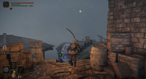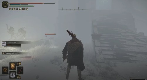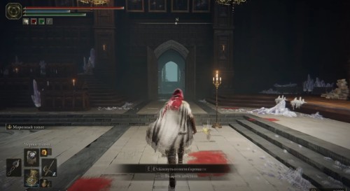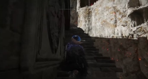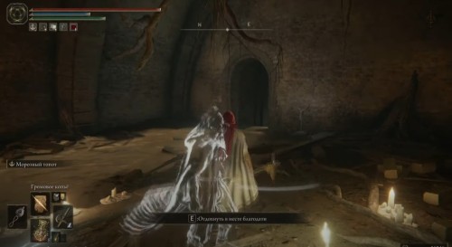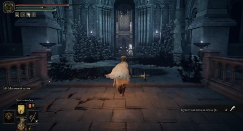 В конце комнаты с левой стороны расположен проход, ведущий к большой лестнице, которая приведет вас в другую локацию с двумя ложными слезами: одна из них вооружена Цвайхендером, а другая – пикой и башенным щитом. Здесь вы также столкнетесь с монахом Нокса. Позади них стоит сундук с талисманом.