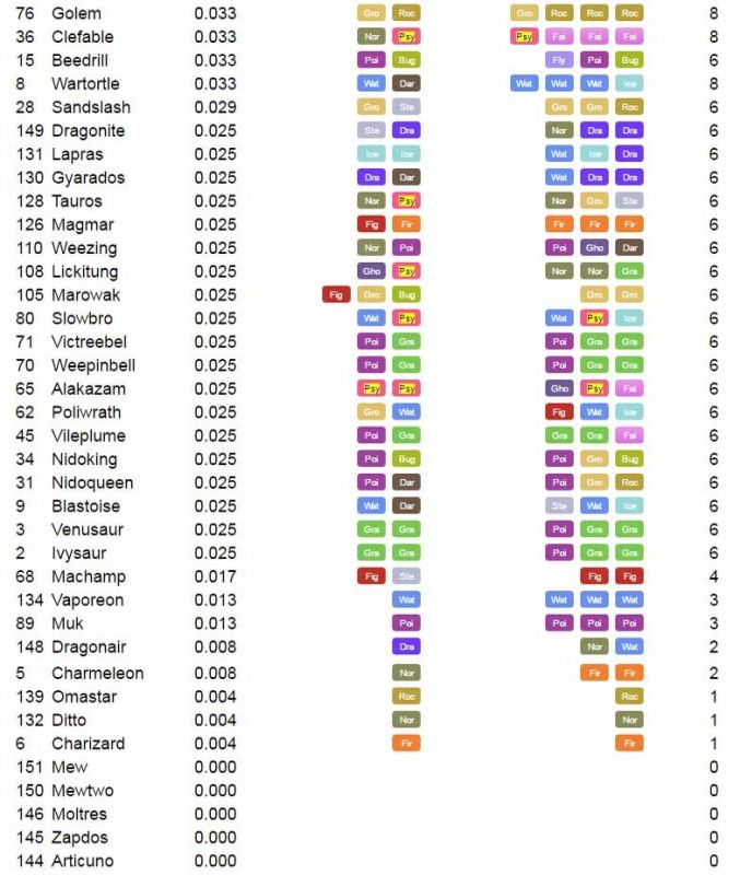 Так что наш рейтинг легендарных и редких покемонов будет базироваться не только на статистических данных, собранных игроками, но и с учетом вышеуказанной особенности проекта. Кстати, под спойлером представлена таблица со всеми существующими в игре покемонами, причем, некоторых из них до сих пор никто не поймал. Это в первую очередь касается Мью (Mew) и Мью Ту (Mewtwo).