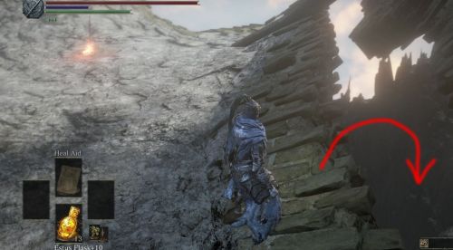 Этим третьим костром является точка «Среди руин Земляного Пика». Попав сюда, взгляните на правую сторону. Вы заметите обрыв. Прыгните вниз и вы отыщите пилигрима второго ангелочка. Уничтожьте его, а потом поднимитесь по корням.