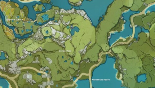 Первый факел стоит прямо возле тотема, второй – находится за Анемо барьером (через него можно пролететь, если спрыгнуть с выступа на юге), третий – возле скалы на севере, а четвертый – между деревьев и неподалеку от лагеря хиличурлов на западе.