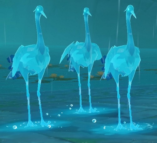 - Мимики-Журавли — существа, похожие на лазурных журавлей, нападают на игрока издалека, хлопая крыльями и создавая мощные волны. Если подойти к ним близко, то они отпрыгнут назад, как это делают застрельщики Фатуи.