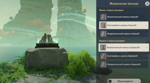 Если вы уже прошли головоломку с Электро монументами, то ничего менять не нужно. В ином случае убедитесь, что у вас стоят: Светящийся камень (левый) и Безмятежный камень (правый). После этого переместитесь на Остров пудинга.