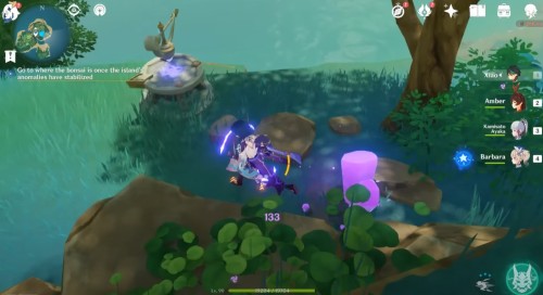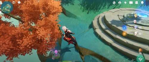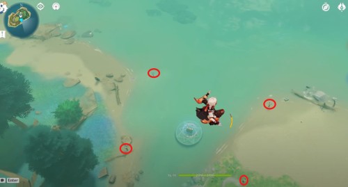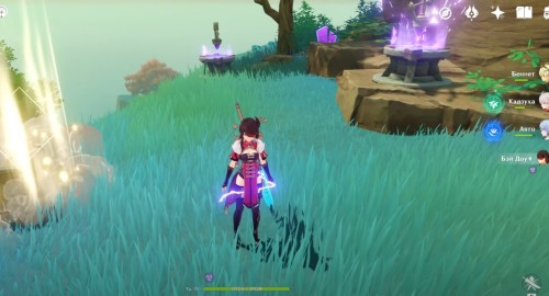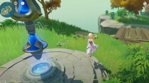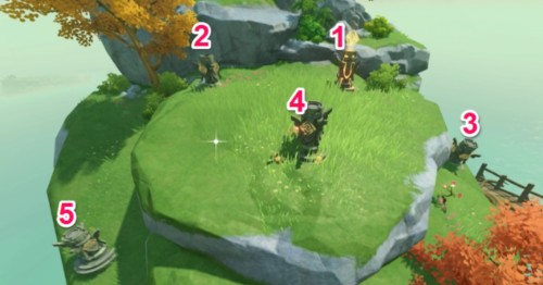 Появившись возле телепорта, бегите на юго-запад. Там вы обнаружите 5 Гео тотемов, которые нужно активировать в определенной последовательности. Нужный порядок показан на втором скриншоте ниже. Если вы хотите узнать его самостоятельно, то нужно посмотреть, как двигается Электро фея, о которой мы рассказали ранее.