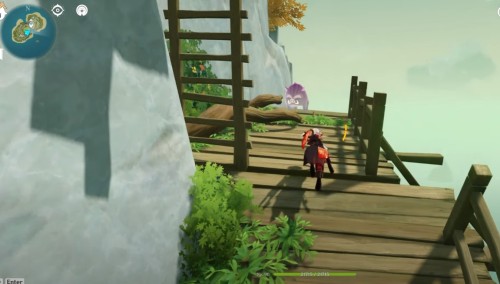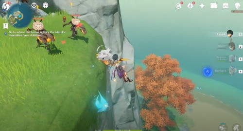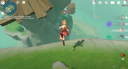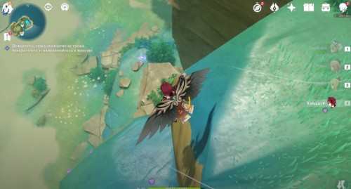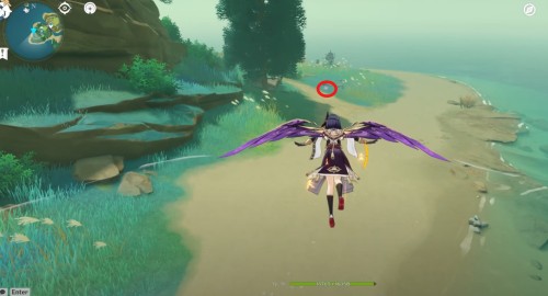 Появившись возле телепорта, бегите к обрыву впереди (рядом с деревянным мостиком). Внизу на выступе вы увидите Анемо фею, находящуюся под воздушным барьером. Залетите внутрь. Затем начните следовать за духом, спускаясь вниз.