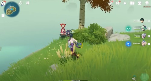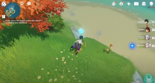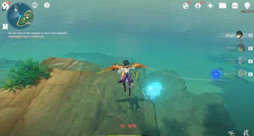 Выберите следующие камни на бонсае: Безмятежный камень (левый) и Светящийся камень (правый). Затем переместитесь на остров и бегите в его западную часть. Там на пляже вы увидите фиолетовую птицу. Подойдите к ней и начните следовать за духом. На скриншотах ниже показаны все места, где он останавливается.