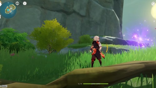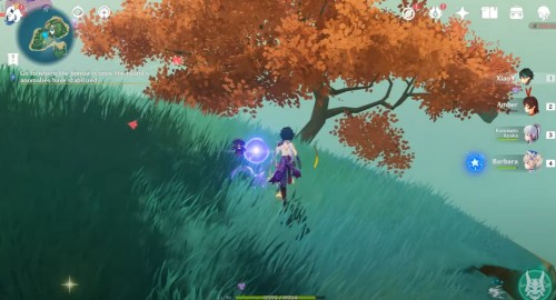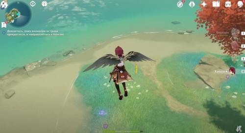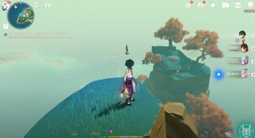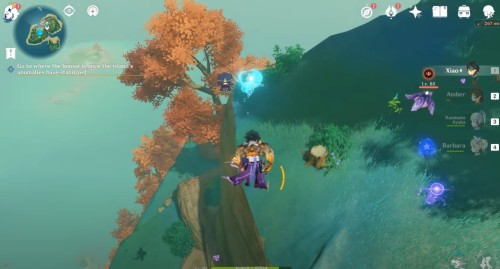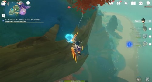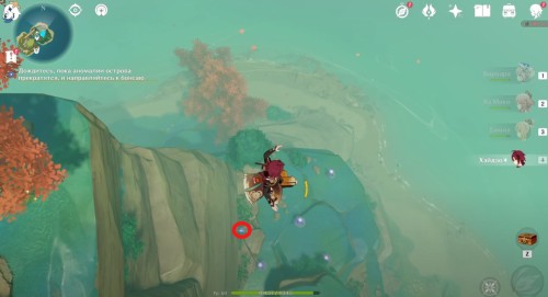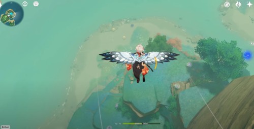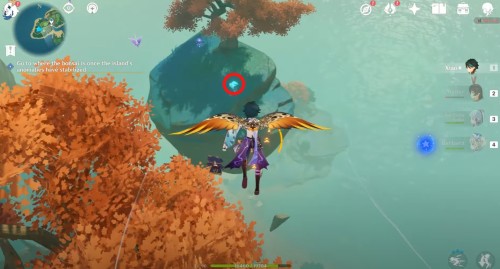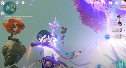 Появившись возле телепорта, перелетите на другую скалу, расположенную на юго-западе. Там взаимодействуйте с Электро цветком, а затем с помощью громовых сфер поднимитесь на парящие островки наверху. Вам нужно попасть на тот, где растет дерево и летает фея (показан на скриншотах ниже).