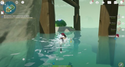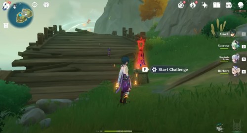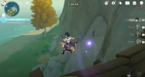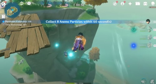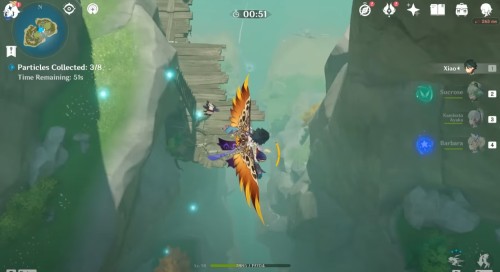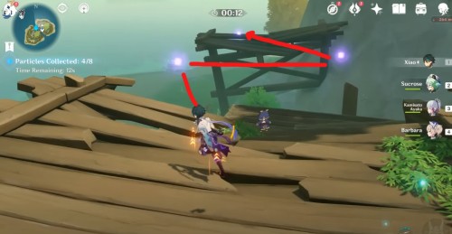 Чтобы выполнить этот челлендж, советуем вам взять двух Анемо героев в команду для ускорения всех ее членов. После начала гонки, начните бежать зигзагами, собрав по дороге первые 4 частицы. Затем спланируйте вначале влево, а потом вправо к столбу.