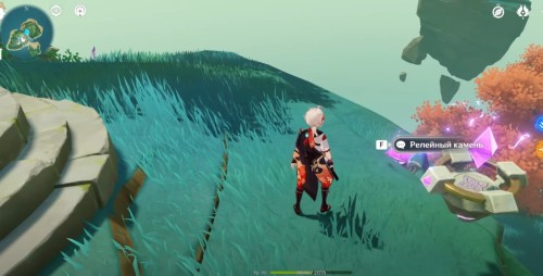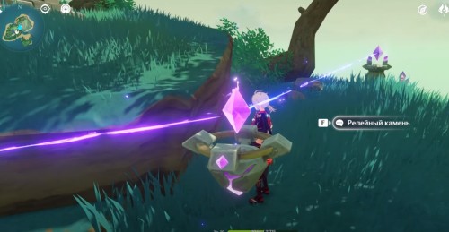 Появившись возле телепорта, вы сразу же увидите рядом релейный камень. Заберите его и спуститесь на нижний выступ. Поставьте этот релейный камень между двумя фиолетовыми кристаллами, чтобы создать связь.