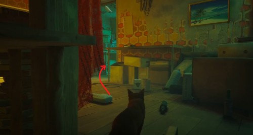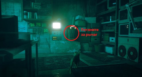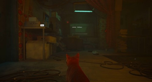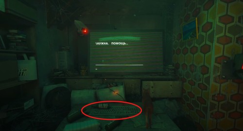 Дойдя до квартиры в 3-й главе, вам необходимо будет подойти к компьютеру с огромным экраном, на котором можно увидеть надпись «Нужна помощь…». Подойдите к столу, запрыгните на него, а потом начните ходить по клавиатуре. Можете не пытаться набирать определенные слова – достаточно печатать любые символы для «установления связи».