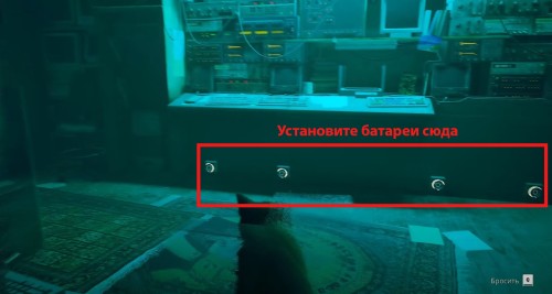 Четвертый аккумулятор лежит на верхней полке, установленной к левой стене. Чтобы добраться до него, сначала прыгните на табуретку, а с нее уже на полку. Схватите батарею и присоедините ее к последнему штекеру.