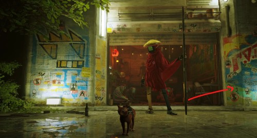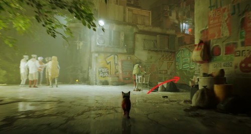После попадания в Трущобы вы встретите Хранителя. От него двигайтесь направо, спуститесь вниз по лестнице, и вы окажитесь на рынке, с левой стороны которого будет сидеть Азуз. У него можно будет приобрести Открытку (3 банки энергетика), электрический кабель (моющее средство Super Spirit) и ноты (1 банка энергетика).