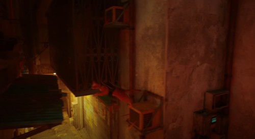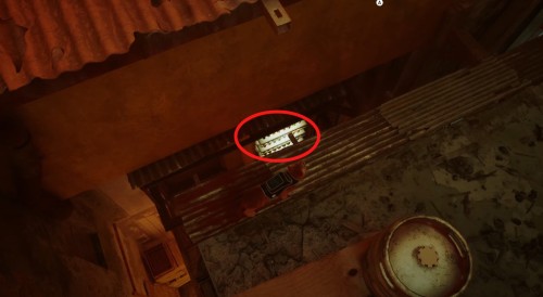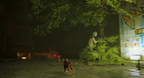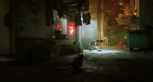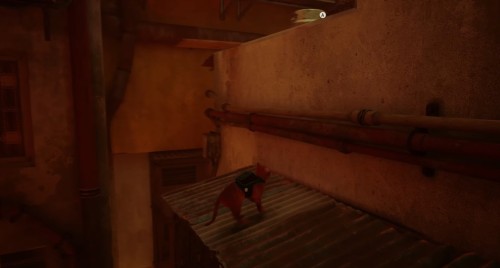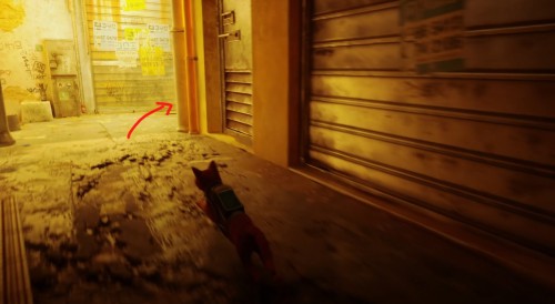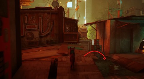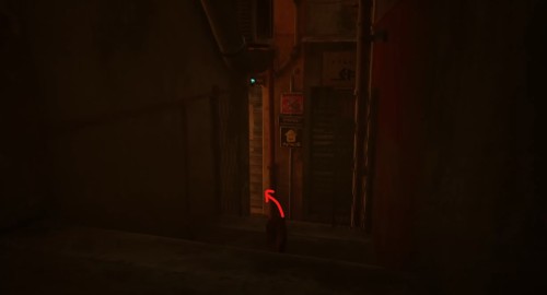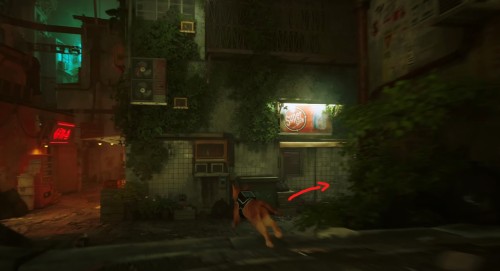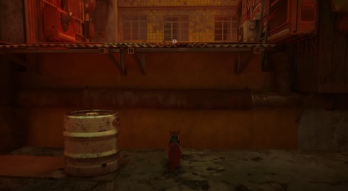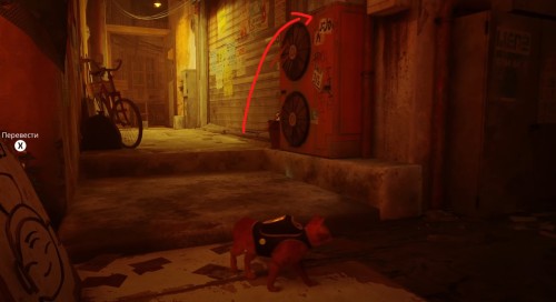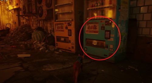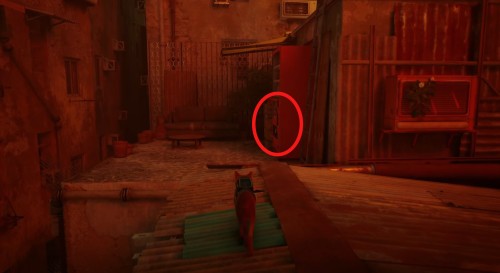 Перепрыгните на козырек с левой стороны, пройдите по нему и заберитесь на полку справа, а с нее – на верхнюю часть балкона. Затем залезьте на крышу здания. Справа вы заметите робота с тростью и диван. Поверните налево и поднимитесь на кровлю другого дома. Повернув камеру еще левее, вы увидите нужный красный торговый автомат.