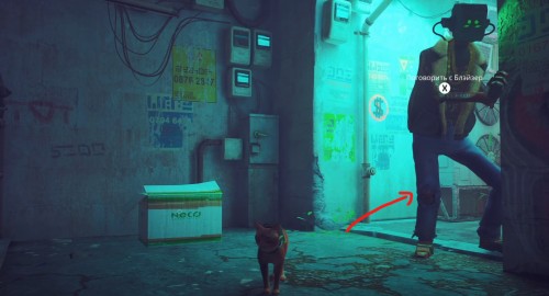 Робот проснется и отправится в магазин головных уборов. Тоже бегите к входу в здание. Справа от прохода найдите коробку и залезьте в нее, чтобы незаметно проникнуть в магазинчик. Выберитесь из коробки, схватите каску и бегите к квестодателю.