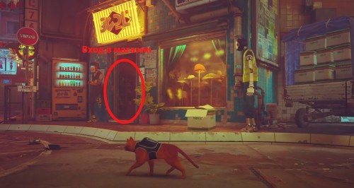 Вернитесь на центральную площадь. Возле торгового автомата вы увидите магазин по продаже головных уборов, однако вас даже не пустят внутрь. Поэтому пройдите к бару, расположенному неподалеку и отмеченному красной неоновой вывеской.