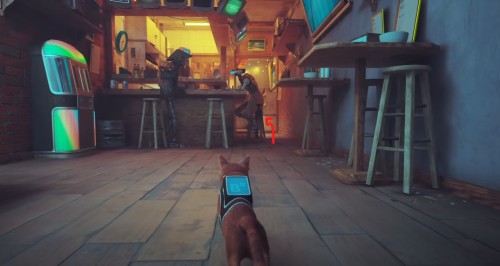Войдите в заведение и бегите вперед мимо барной стойки. Пройдите в заднюю комнату, где вы обнаружите спящего на столе робота. На верхней правой полке можно заметить коробку с бутылками – вам нужно будет уронить их на рабочего. Для этого заберитесь на табуретку, а потом на полку. Далее просто сбросьте ящик вниз.
