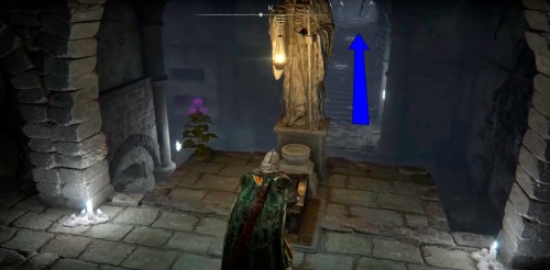 Свернув направо, идите вперед. Наткнувшись на статую, активируйте рычаг. После этого откроется проход к владыке подземелья. Но перед походом, не забудьте забрать трофей слева от золотой статуи: