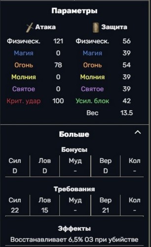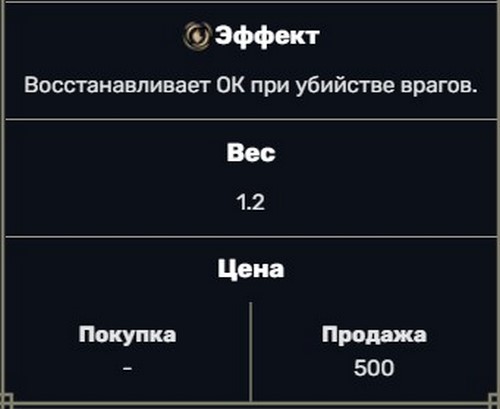 Богохульный клинок (двуручный меч) |  | Пламя разбойника (25 ОК) – наносит огненный урон врагам и восстанавливает здоровье герою при каждом попадании. | 0 рун |