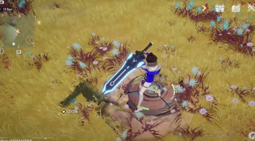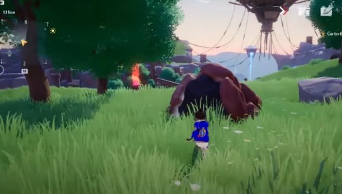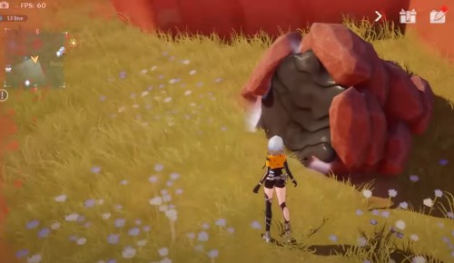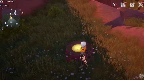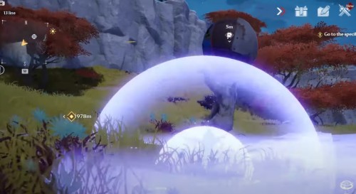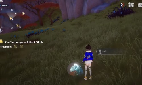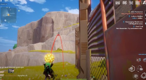 Неподалеку от предыдущего ядра отыщите желтую сферу на лугу (точное место показано на скриншотах ниже). Поднимите ее и начните нести вперед, двигаясь вдоль ограждения. Взберитесь на выступ и продолжайте двигаться к скале. Вскоре вы увидите на ней цветок, в который и нужно бросить шар.