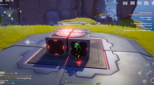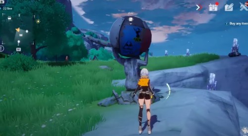 Переместитесь к указанному на скриншоте телепорту и пройдите немного на запад. На лугу вы обнаружите статую, держащую на плечах сферу. Используйте реликт Странный куб (Strange Cube), чтобы столкнуть шар и раскрыть золотую крутку.