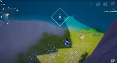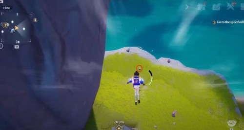 Пройдите по координатам, показанным на изображениях ниже. Там возле скалы вы увидите зеленый шар. Поднимите его и начните идти вперед к обрыву. На нижнем выступе у края утеса вы увидите коричневый цветок, в который и нужно кинуть эту сферу.