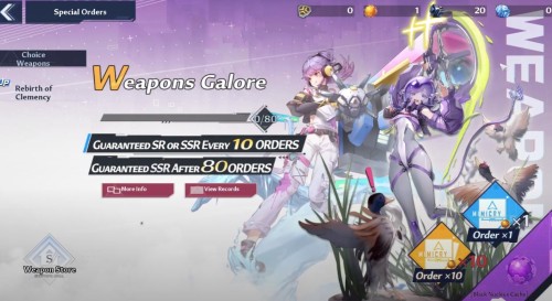 После этого перейдите в меню Special Orders и выберите стандартный золотой баннер Weapons Galore, в котором получить SSR персонажа можно в первые 30 круток. Добыв необходимого героя, продолжайте играть на данном аккаунте. В ином случае создайте новую учетную запись и снова проделайте все указанные действия.