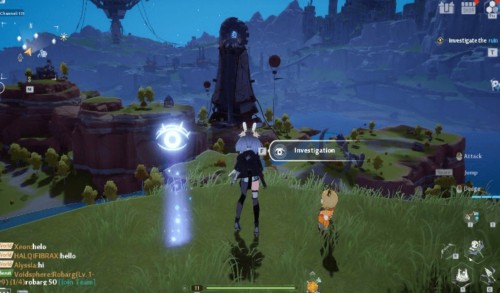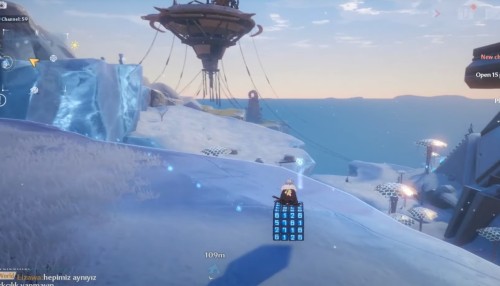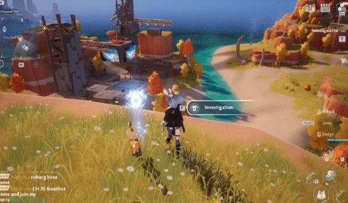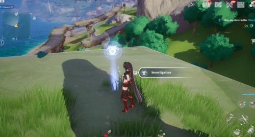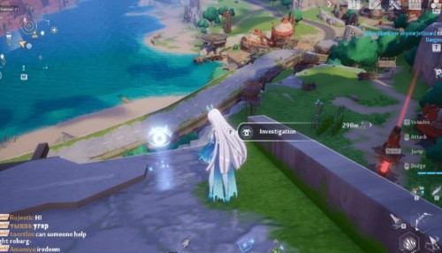 Переместитесь к показанному на скриншоте ниже телепорту, а затем направляйтесь на восток вдоль побережья водоема. Вам нужно будет подняться на возвышенность на правом берегу залива. С нее будет открываться отличный вид на парящий остров.
