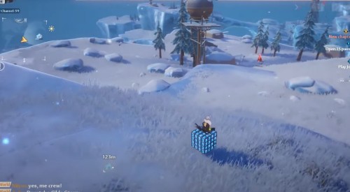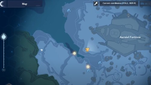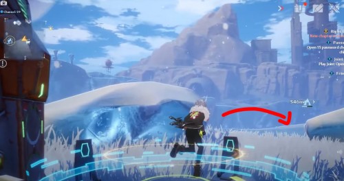 Телепортируйтесь к вратам Spacerift: Aarniel Fortress, поверните камеру налево и заберитесь на ледяной склон впереди. Поднявшись на него, обойдите глыбу льда с правой стороны, чтобы оказаться на верхушке скалы, на которой стоят ледяные колонны. Пробегите мимо этих столбов и первого сопла двигателя.