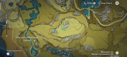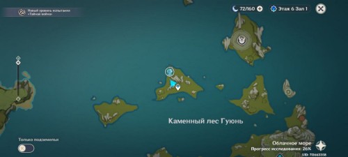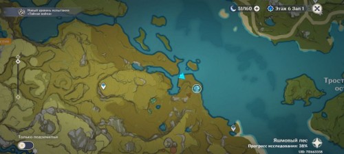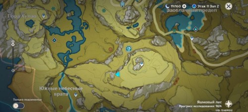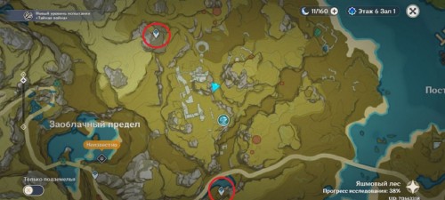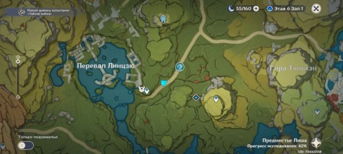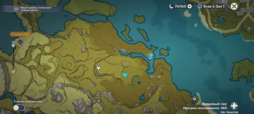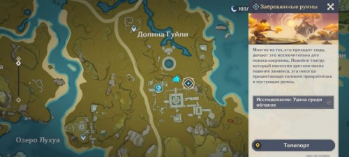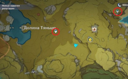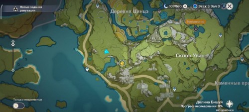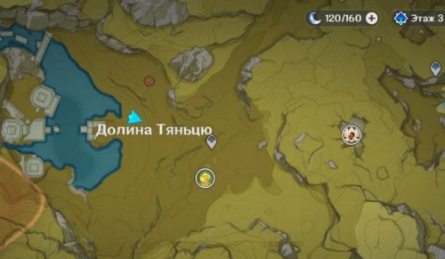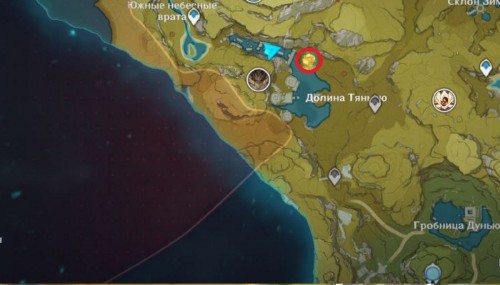 Следующее испытание находится на возвышенности к югу от Пиро орхидеи. Добраться до него можно от одного из двух телепортов, отмеченных нами на карте: точка в долине Тяньцю ближе, но вам придется взобраться на гору, тогда как телепорт на северо-востоке уже находится на возвышенности.