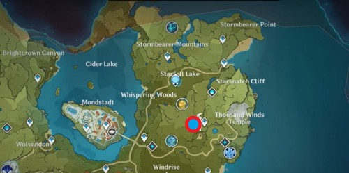Следующий цветок расположен в районе Вольфендома. Телепортируйтесь к подземелью «Сад Сесилии» и поднимайтесь на юго-восточную скалу. Недалеко от цветка находится усыпальница глубин Мондштадта.