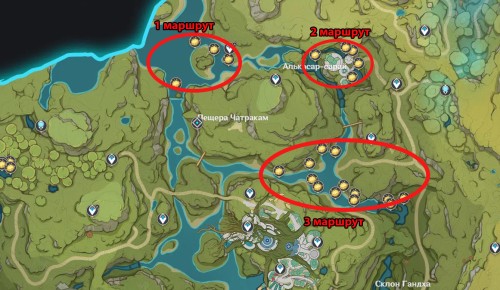 Далее мы укажем все лучшие маршруты для фарма – они позволят вам собрать 54 цветка за минимальное количество времени. С расположением абсолютно всех лотосов нилотпала можно ознакомиться на интерактивной карте Сумеру.