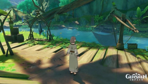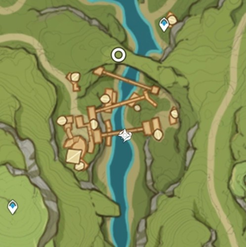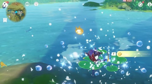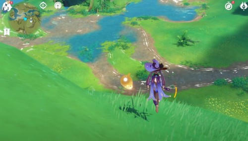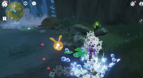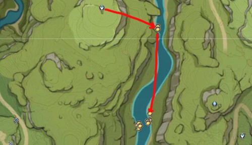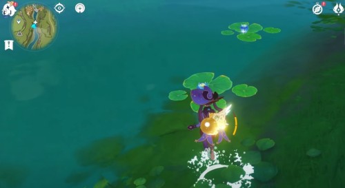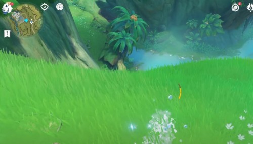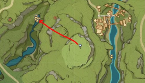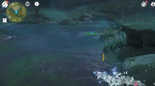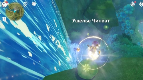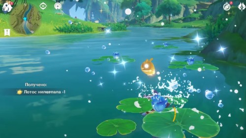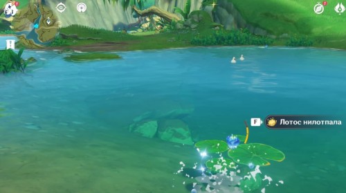 Переместитесь к телепорту на утесе и спрыгните вниз, начав лететь на запад. Возле лагеря хиличурлов будет расщелина, заполненная водой. Спуститесь туда и соберите 6 лотосов нилотпала. Три из них находятся напротив первых трех, со стороны высокого берега.