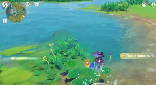 Телепортируйтесь к указанной точке, поверните направо и спрыгните с обрыва вниз к устью реки впереди. Затем возьмитесь за сбор цветков по продемонстрированному маршруту. Начните с восточной стороны, а потом двигайтесь на запад. Здесь можно собрать 9 лотосов нилотпала.