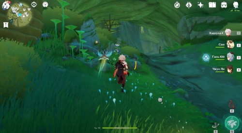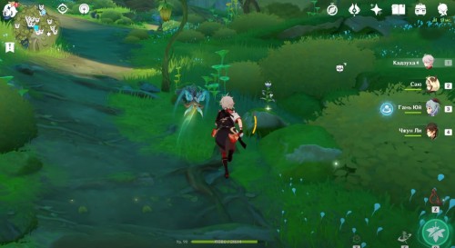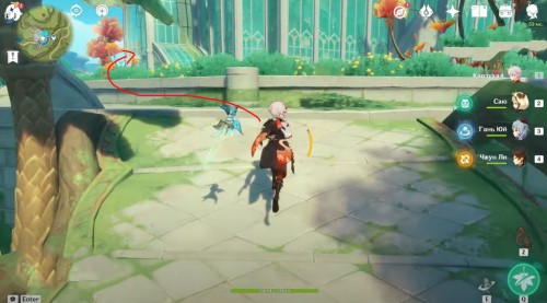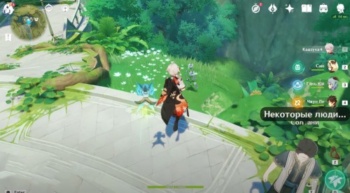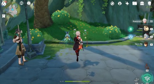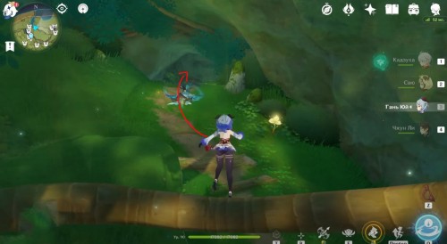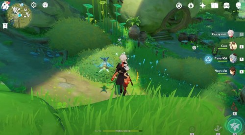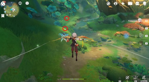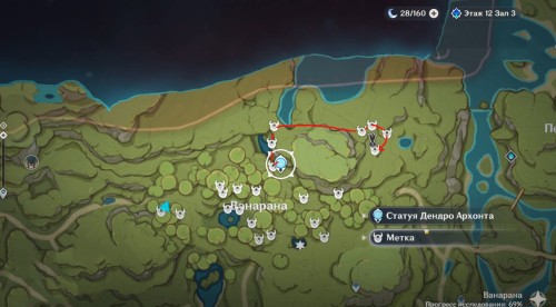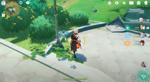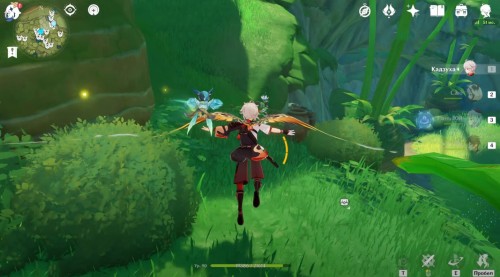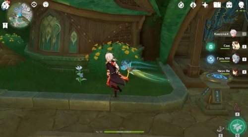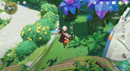 Телепортируйтесь к статуе Дендро архонта, развернитесь и бегите по дорожке сначала наверх, а потом вниз. Соберите слева первый цветок. Бегите дальше наверх и сорвите справа рядом с кустами второй бутон.