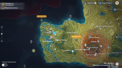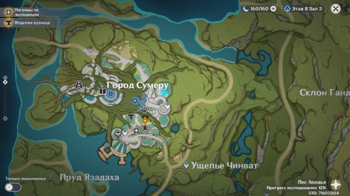 - Исследовать Сумеру. За каждые 20%, 40% и 60% прогресса в изучении региона вы будете получать по 100 опыта репутации и 20 000 моры. Речь идет об активации телепортационных точек, нахождении сундуков, сборе дендрокулов и так далее.