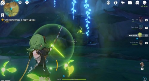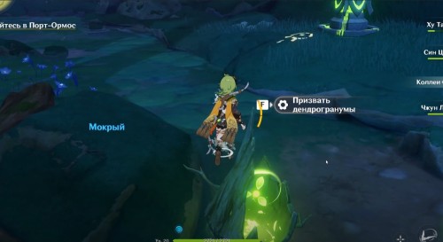 Здесь вы обнаружите пять Дендро тотемов, которые вам необходимо активировать в определенной последовательности. Для их включения потребуется Дендро персонаж (подойдет и Путешественник). Один из монументов спрятан за камнем с зеленой сферой – для его разрушения нужно взять дендрогранум с ветви неподалеку, а затем атаковать заряженным выстрелом или ударом зеленый шар.