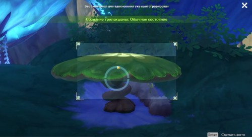 Переместитесь к статуе семи архонтов к югу от леса Мотийимы. Там вы обнаружите пружинистый гриб. Сфотографируйте его в обычном состоянии (наверху должна появиться соответствующая зеленая надпись).