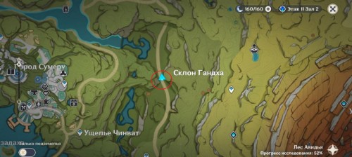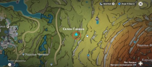 Продолжайте идти на запад от склона Гандха. Сундук окружен грибами, наносящими Дендро урон, поэтому лучше подойти к нему сзади, и он откроется.